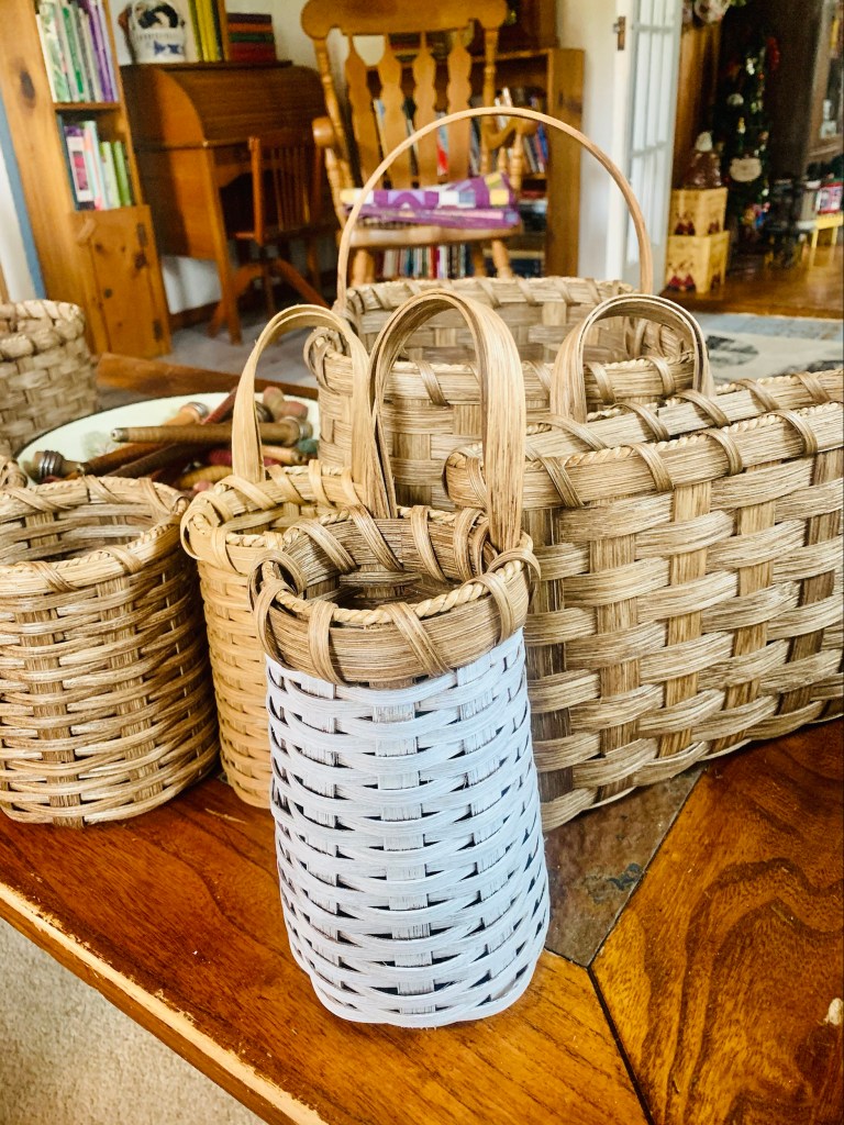 So let’s go back a few days. Before the baskets are stained, my partner in crime, ie. my husband, uses a small torch on them to remove all of the “hairs” from the reed. Then we stain them. After they dry for a few days, I do the final trim and initial and date the bottom.